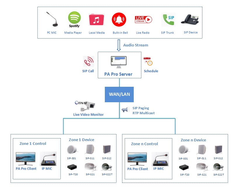 Phần mềm hệ thống âm thanh thông báo IP Audio PA System Pro là phần mềm quản lý các loa thông báo SIP và RTP Muliticast. Nó có thể quản lý và kiểm soát các hệ thống PA khác nhau một cách chuyên nghiệp. PA System Pro hỗ trợ người dùng thiết lập đầu vào âm thanh, lịch phát, phân vùng, chia nhóm,….. và tương thích với các máy tính PC cài Windows.